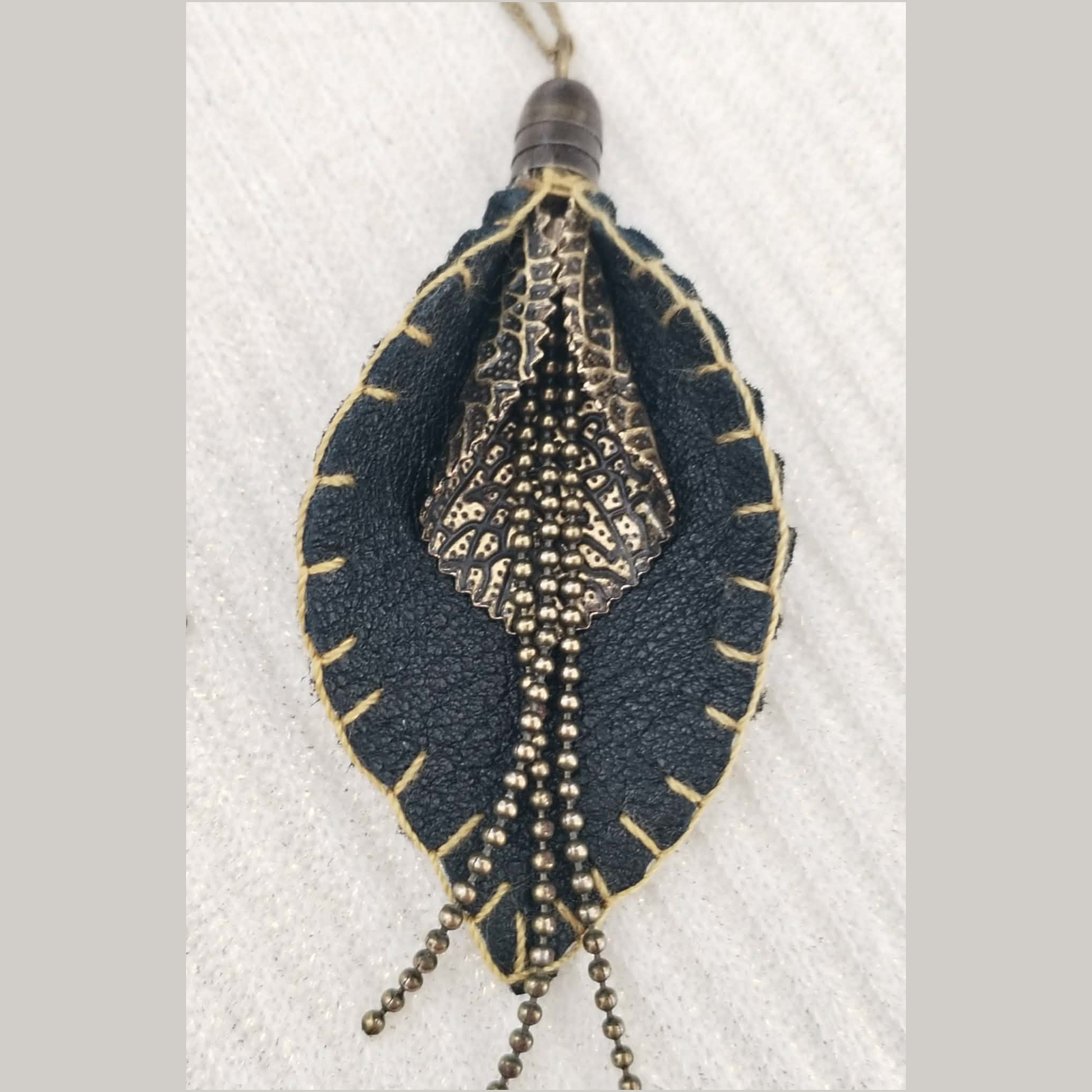 The necklace and the earring are made from leather and jewellery metals.